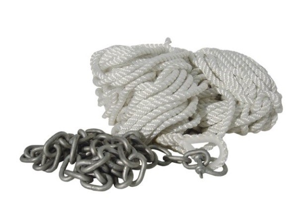 Cabo de poliester multifilamento, con gaza, guardacabos de nylon, grillete galvanizado y 1,5 m de cadena galvanizada.