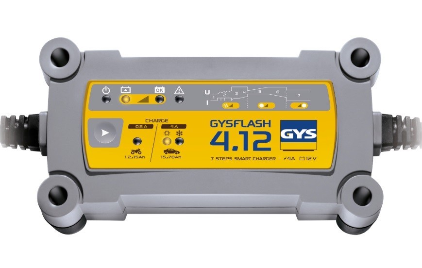 El GYSFLASH 4.12 ha sido especialmente diseñado para recargar baterías de 12V de motos, motos acuáticas, karts o cortacesped. Dispone de una curva de carga inteligente de 7 etapas que aseguran una carga óptima y dos veces más rápida que un cargador tradicional de 4A.